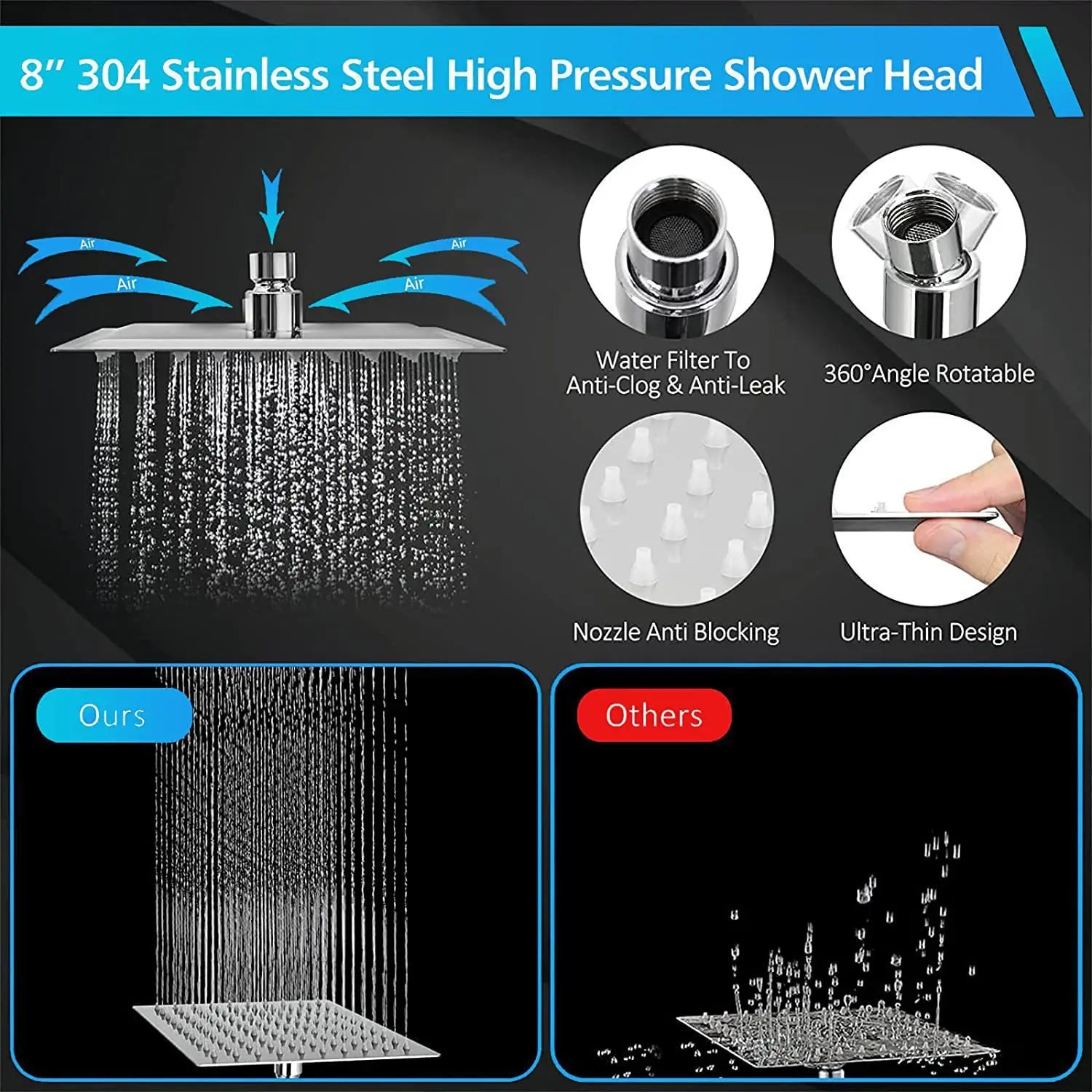 The 8-Inch High Pressure Shower Head with Rainfall and Handheld Spray is a luxurious upgrade that transforms any bathroom into a spa-like experience. Featuring a large, 8-inch rainfall head, this shower provides wide water coverage that mimics the sensation of standing in a natural rain shower, creating a soothing, immersive experience. With high-pressure jets that deliver consistent water flow, the shower head ensures thorough rinsing, even if water pressure is lower in your area. The rainfall head is crafted from high-quality stainless steel with anti-rust properties, giving it a sleek, modern look while ensuring long-lasting durability.